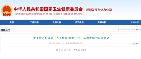 脉讯速览 11月4日,国务院印发《关于深入实施“人工智能+”行动的意见》(国发〔2025〕11号),明确提出以新一代人工智能技术深度赋能卫生健康行业高质量...